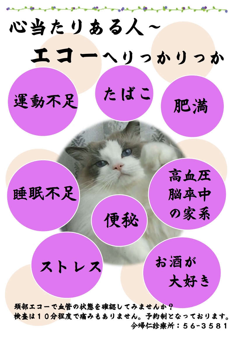 頚部エコーで血管の状態を確認してみませんか? 検査は10分程度で痛みもありません。予約制となっております。
